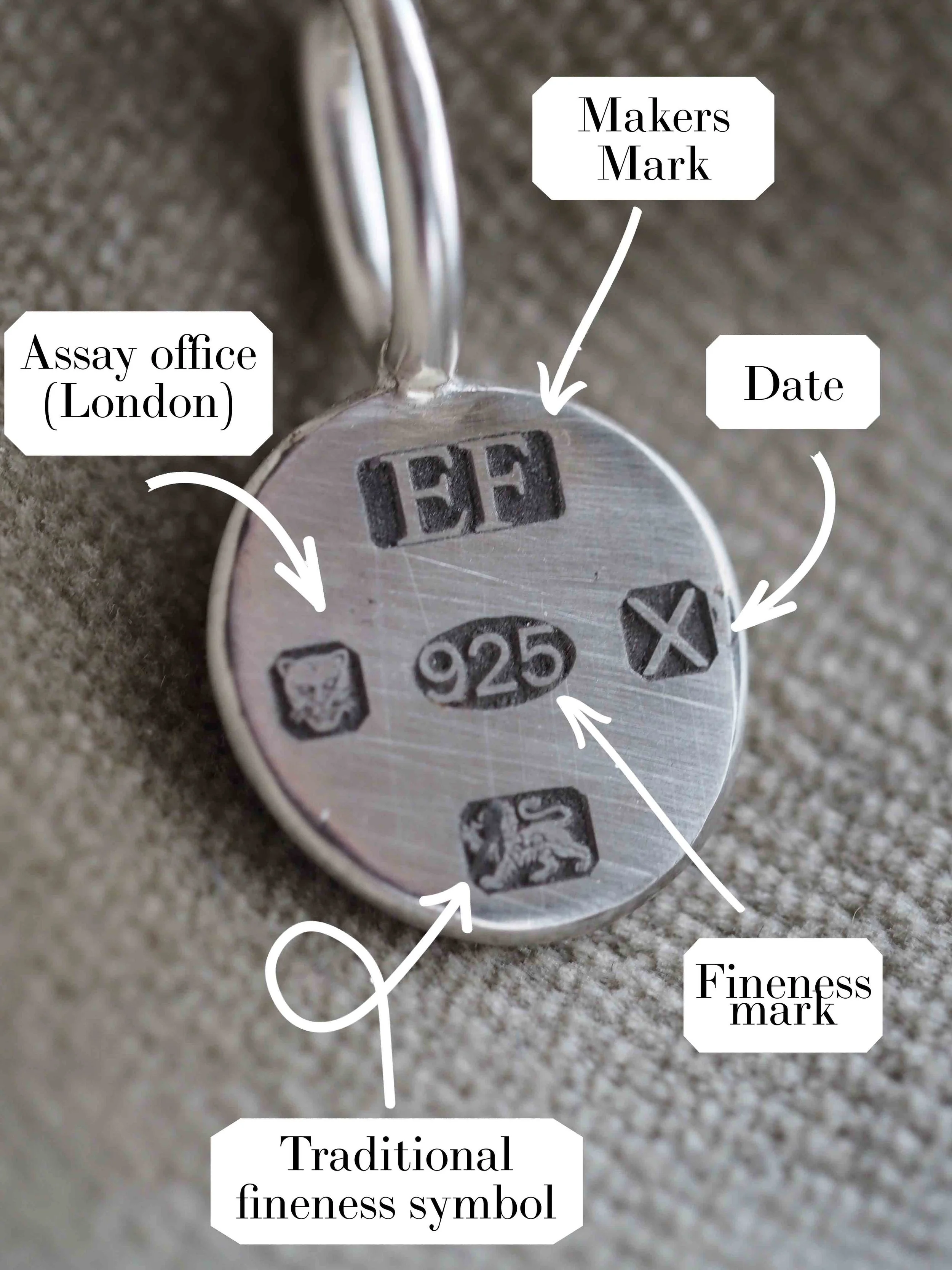 Any item sold in the UK that is described as sold ‘gold’, ‘silver’, or ‘platinum’ that is above a certain weight must carry a hallmark. A hallmark is a series of marks that communicate information about the piece, including the purity of the metal, the maker, as well as when and where it was hallmarked.